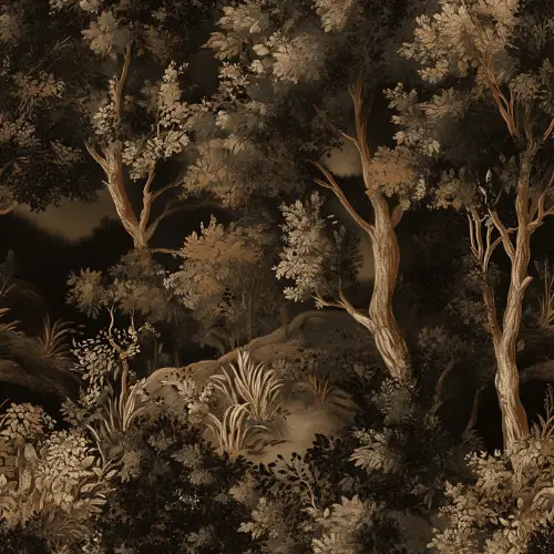 Amarante Woodland Wallpaper – Rich sepia tones and forest details bring depth, warmth, and natural drama to living rooms, dining, or libraries.