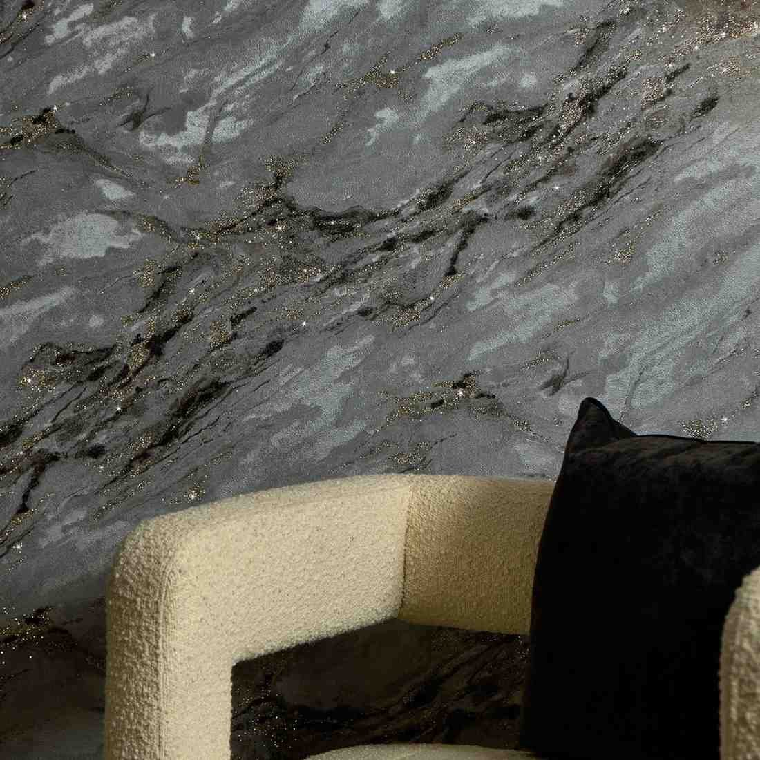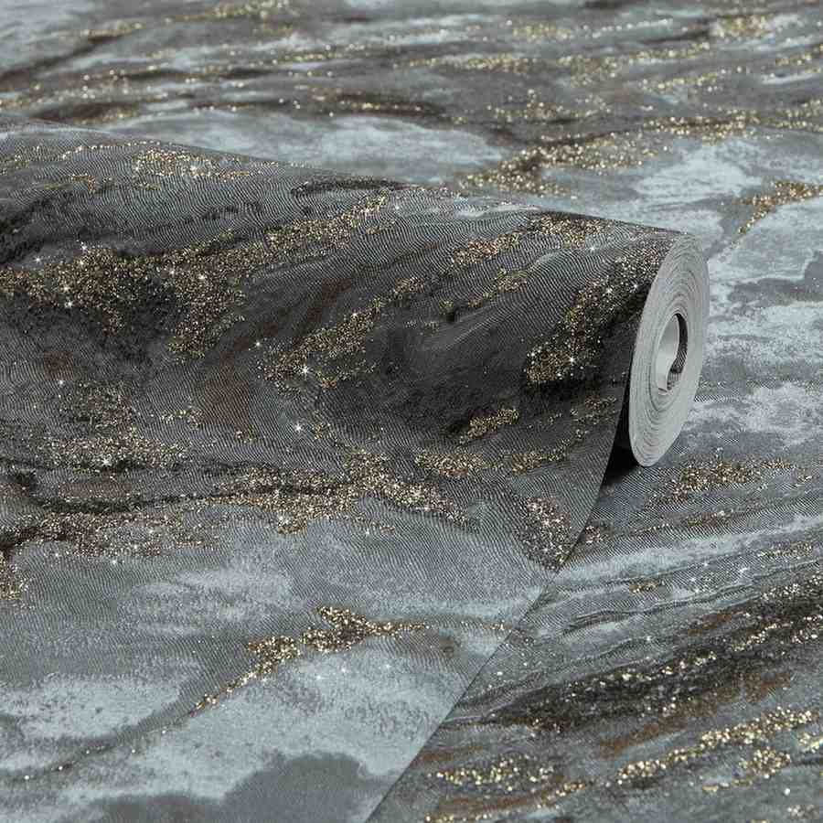 Add a touch of luxury with decadence wallpaper in grey and charcoal featuring subtle gold glitter for a sophisticated modern interior perfect for living rooms bedrooms or stylish accent walls.