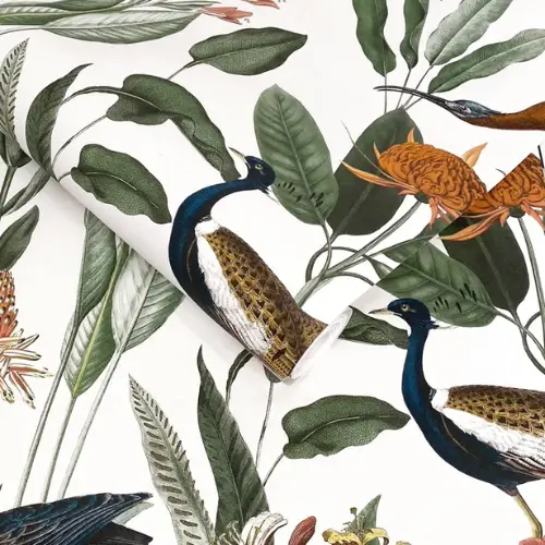 Glasshouse Day White Kitchen Wallpaper features bold birds & large leafy prints on a crisp backdrop. A dramatic, stylish design that adds freshness & statement charm to Abu Dhabi kitchens.
