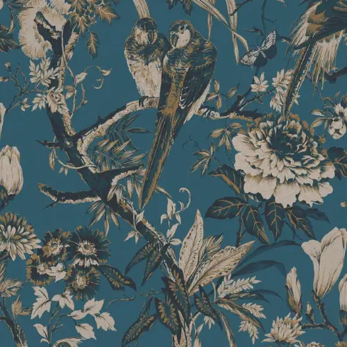 Add life to your walls with Golden Blue Aviary Wallpaper adorned with golden accents, birds, and flowers. A perfect mix of serenity and luxury, it creates a vibrant focal point in any room.