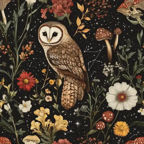 Embrace the magic of the night with this Midnight Harmony Living Room Wallpapers A wise owl rests beneath a starlit sky, surrounded by wildflowers, mushrooms, and glowing constellations. The intricate blend of flora and fauna against a dark backdrop adds depth, wonder, and a touch of mystery to any space—perfect for those who adore nature and celestial beauty.