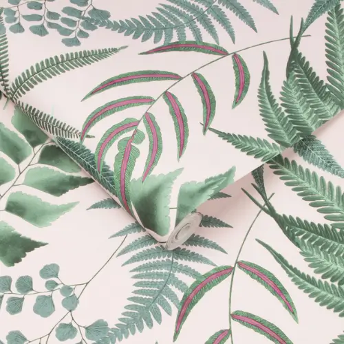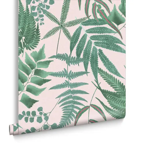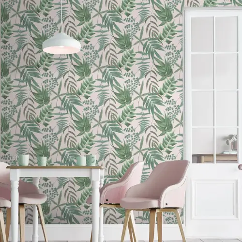 Midsummer Fern Blush Botanical Kitchen Wallpaper pairs rosy pink tones with lush greenery & fuchsia accents. A bold botanical design that adds warmth, freshness & charm to Abu Dhabi kitchens.