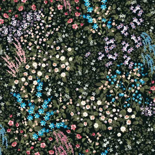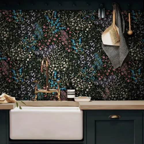 Painterly Flora Black Bathroom Wallpaper showcases hand-painted blooms on a deep black base, blending romantic woodland charm with a modern, moisture-resistant finish.