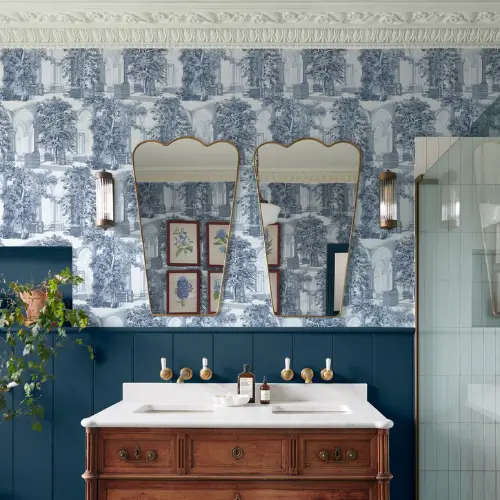 Rivington Folly Bathroom Wallpaper showcases blue and white hues with trees and arches, blending nature and architecture into a tranquil, moisture-resistant bathroom design.
