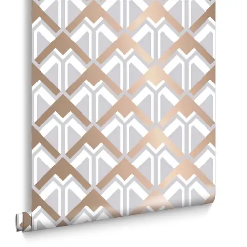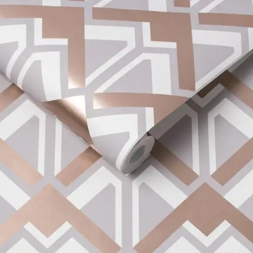 Add Art Deco elegance with this geometric Rose Gold Stardust Wallpaper. Featuring rose gold metallics and pearlescent detailing, it brings bold style and a modern statement to any space.
